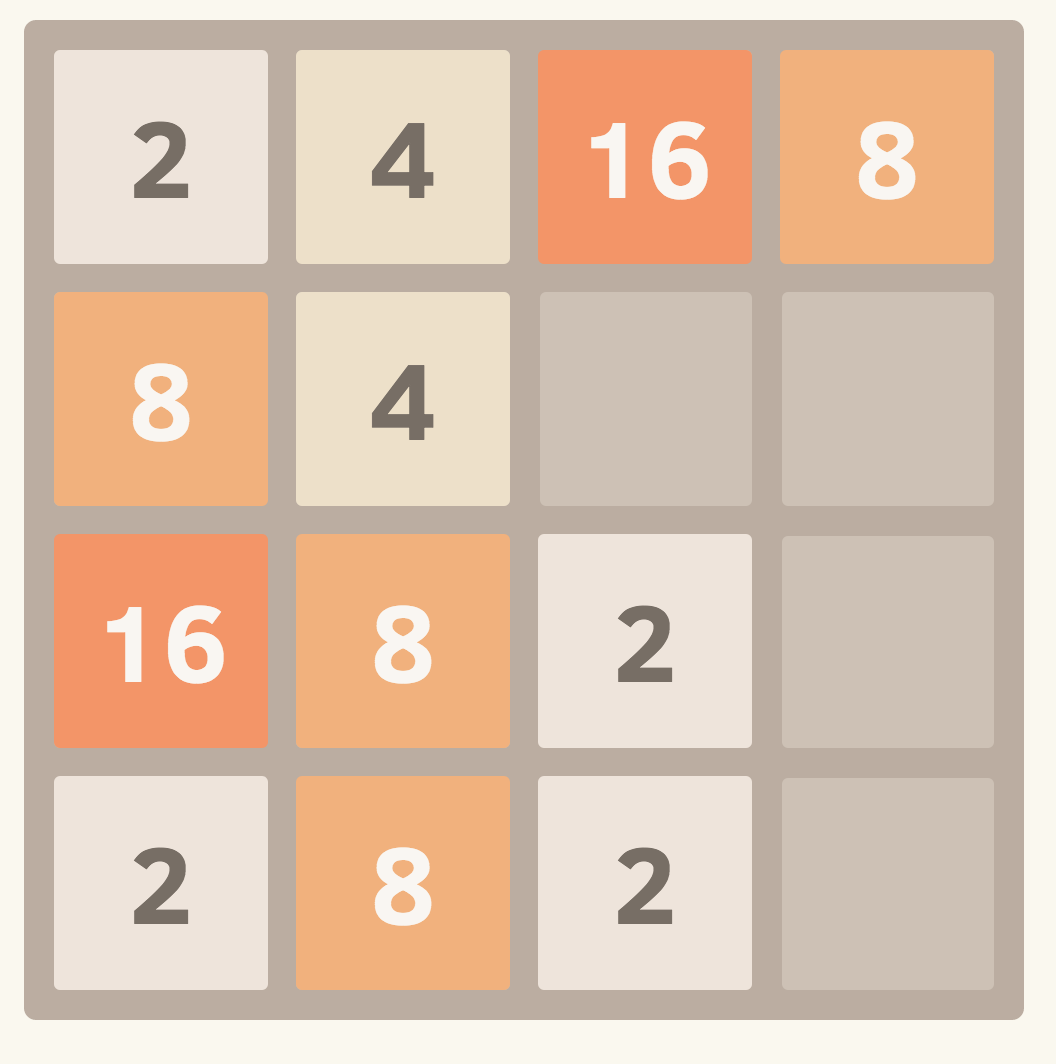 2048 게임은 4×4 크기의 보드에서 혼자 즐기는 재미있는 게임이다. 이 링크를 누르면 게임을 해볼 수 있다.